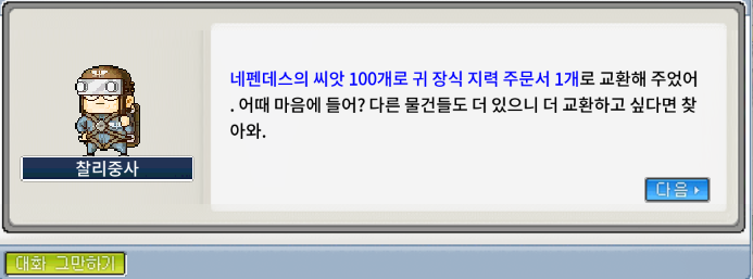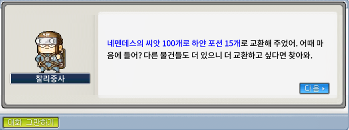 네펜데스의 씨앗 100개를 교환해줍니다.(찰리 중사는 한꺼번에 다 교환해주진 않고, 일일이 100개씩 교환해준답니다.)