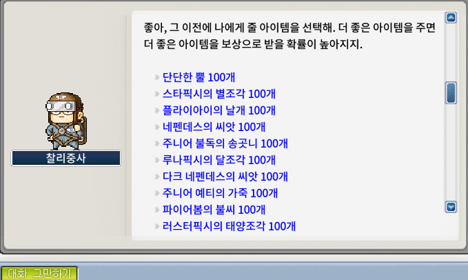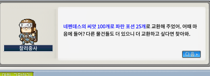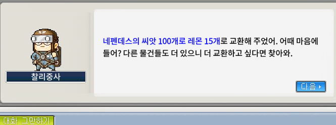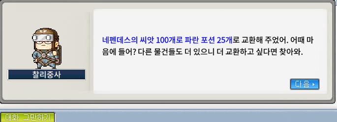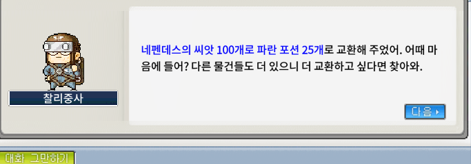 [메이플랜드]메랜 찰리중사와 기싸움 - 네펜데스의 씨앗 800개 교환하기(1일차)
